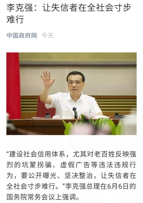 近日,总理在国务院常务会议上,再次强调的,要加快建立黑名单制度,强化信用约束,减少交易成本,形成良好的信用经济环境。“让失信者在全社会寸步难行。”