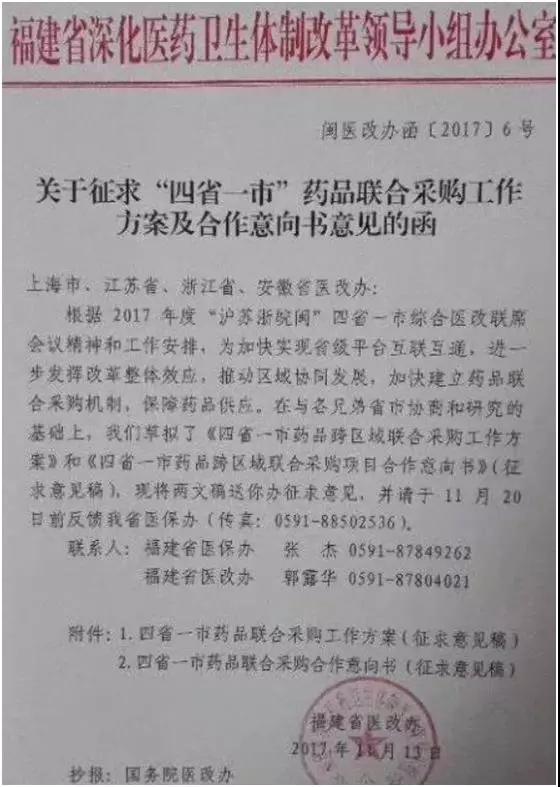 早在去年11月,沪、苏、浙、皖、闽已经开始实现药品的联合采购方案。一份福建省深化医药卫生体制改革领导小组办公室印发的《关于征求“四省一市”药品联合采购工作方案及合作意向书意见的函》掀开了四省一市药品联合采购的序幕。