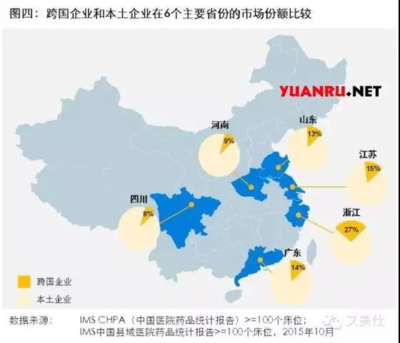 IMS 2017年公布的报告数据显示:6个主要省市的跨国药企和本土药企市场份额中,浙江是跨国药企在中国基层市场的主战场。