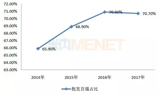 图3:2014-2017年药品批发企业百强规模占总规模情况