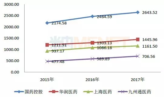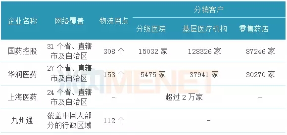 截至2017年底,国药控股下属分销网络已覆盖中国31个省、直辖市及自治区;上海医药通过控股子公司分销网络直接覆盖全国24个省、直辖市及自治区;华润医药覆盖中国27个省、直辖市及自治区;九州通覆盖了中国大部分的行政区域,构成了全国性网络。