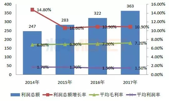 2014-2017年,全国药品流通直报企业利润总额逐年增长,从2015年开始,增长势头趋于平稳,保持在10%左右的增长率;平均毛利率与平均利润率连续4年企稳,平均毛利率保持在7%左右,平均利润率保持在1.5%左右。