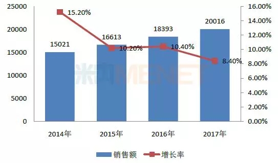 数据显示,近几年来,我国药品流通行业整体规模呈不断扩大态势,增速略有回落。2017年增速虽同比去年有所放缓,但整体规模首次突破20000亿元。
