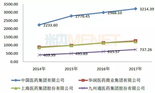 图4:2014-2017年药品批发企业TOP4主营业收入情况(单位:亿元)