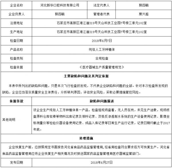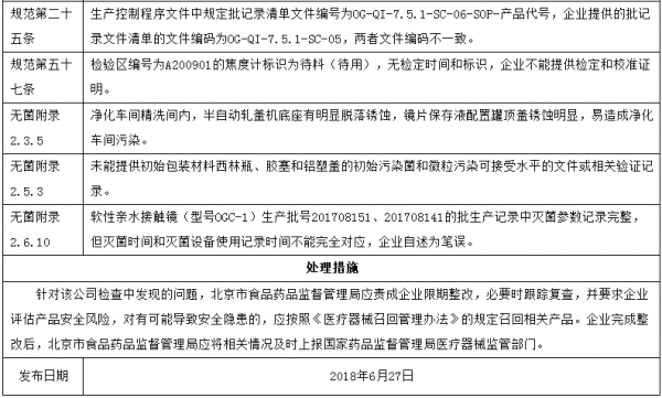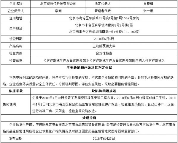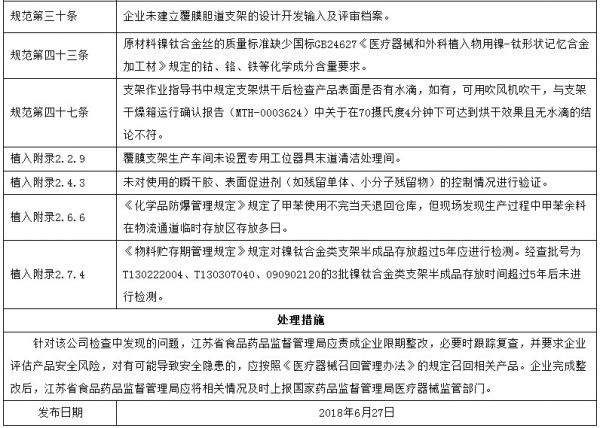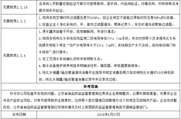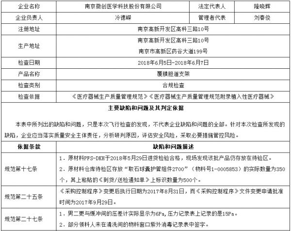 通报显示,6家企业分别位于江苏、湖北、河北、北京等省市,其中3家处于停产状态,另外3家发现多处一般缺陷,被要求限期整改,这其中包括南京微创。 在医疗器械GMP全面实施的背景下,国家药监局飞检很频繁,监管高压之势显现。 以下为飞检通报: 对南京微创医学科技股份有限公司飞行检查通报