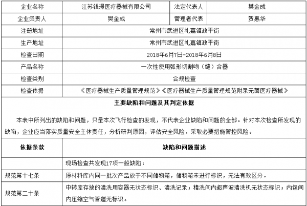 对江苏钱璟医疗器械有限公司飞行检查通报