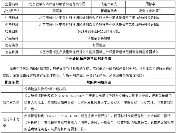 对北京欧蒂卡洁伊隐形眼镜制造有限公司飞行检查通报