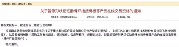 6月28日,浙江省药械采购中心根据国家药监局的飞检通告,发布了《关于暂停形状记忆肋骨环抱接骨板等产品在线交易资格的通知》。