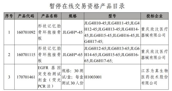 通知称,根据国家药品监督管理局发布的《关于重庆欣汶医疗器械有限公司停产整改的通告》、《对江苏为真生物医药技术股份有限公司飞行检查通报》,以及我省药械集中采购工作有关规定,通过核查、公示等程序,经研究决定,即日起暂停形状记忆肋骨环抱接骨板等产品的在线交易资格。