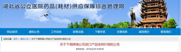 6月29日,湖北省公立医院药品(耗材)供应保障综合管理网发布《关于下调辉瑞公司进口产品挂网价格的公告》