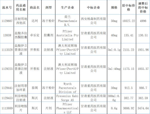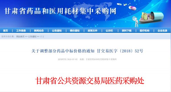 昨日(7月2日),甘肃省药械集中采购网发布《关于调整部分药品中标价格的通知甘交易医字〔2018〕52号》。