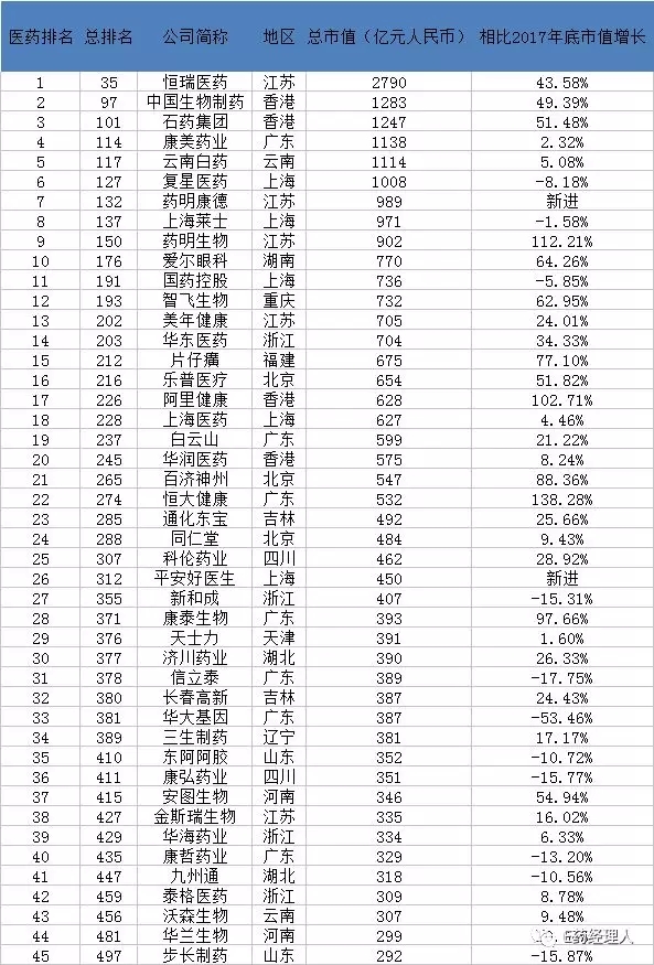 最新市值500强榜单中的药企排名