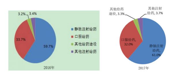 尽管“能吃药不打针,能打针不输液”是世界卫生组织提倡的医学基本用药原则,但是注射剂药效发挥迅速、吸收快,且注射剂不经胃肠道,不受消化系统影响,故剂量准确可靠,适用于不宜口服给药、消化系统障碍或昏迷、抽搐等状态的患者,因此仍是医药市场的主流剂型,在终端市场份额占比超过50%。