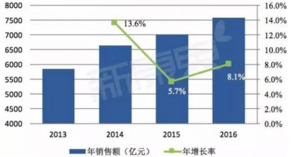 根据新康界披露的数据显示,2013-2016年国内注射剂市场保持增长态势,年复合增长率为6.7%,至2016年国内注射剂用药规模达7577亿元,同比增长8.1%。2017年笔者保守按照5%的增长推算,则其市场规模已在8000亿元左右。