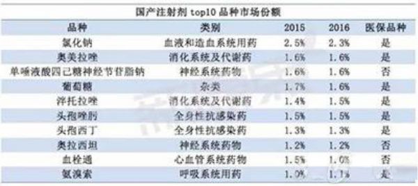 根据一份公开资料信息显示,国产注射剂销售额前三品种为氯化钠、奥美拉唑、单唾液酸四己糖神经节苷脂钠。TOP10品种中有3个品种未纳入2017年版国家医保目录,分别是单唾液酸四己糖神经节苷脂钠、奥拉西坦、血栓通,但是这些品种大多进入多个省份的增补医保目录。