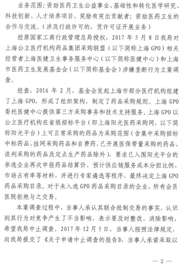 事情的起因,是去年的5月8日,上海工商局对上海公立医疗机构药品集团采购联盟(GPO)相关经营者——上海市医药卫生发展基金会、上海医健卫生事务服务中心涉嫌垄断行为进行立案调查。