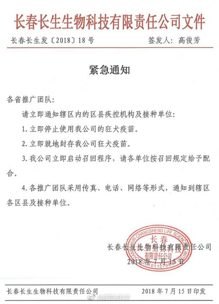 7月15日,长春长生发布紧急通知 ,该通知要求各省推广团队,立即通知辖区内的区县疾控机构及接种单位,立即停止使用公司的狂犬疫苗;立即就地封存公司狂犬疫苗。