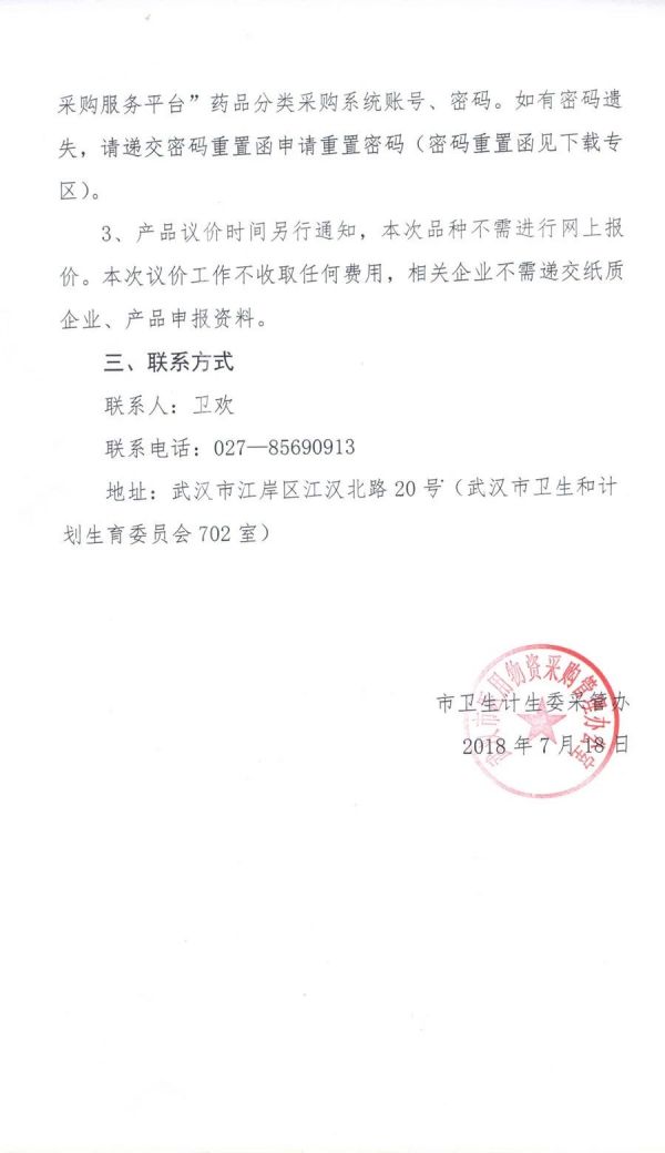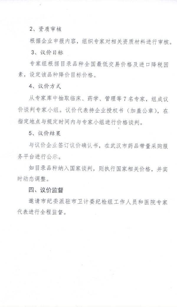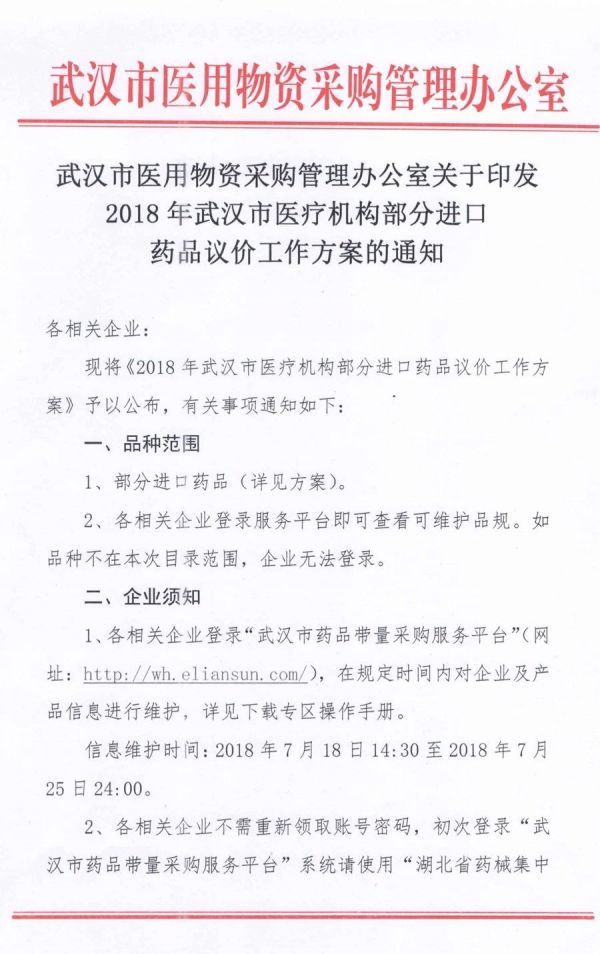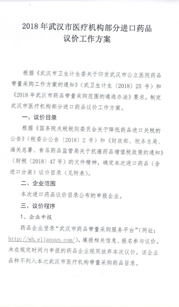 按附件通知,武汉市医疗机构部分进口药品议价工作即将启动,议价目录依据《国务院关税税则委员会关于减低药品进口关税的公告》和《财政部、税务总局、海关总署、食品药品监管局关于抗癌药品增值税政策的通知》确定品种,由药企主动填报信息报名参与议价,若未在规定时间内申报,视同药企放弃本次议价,该企业品种将不列入本次带量采购。