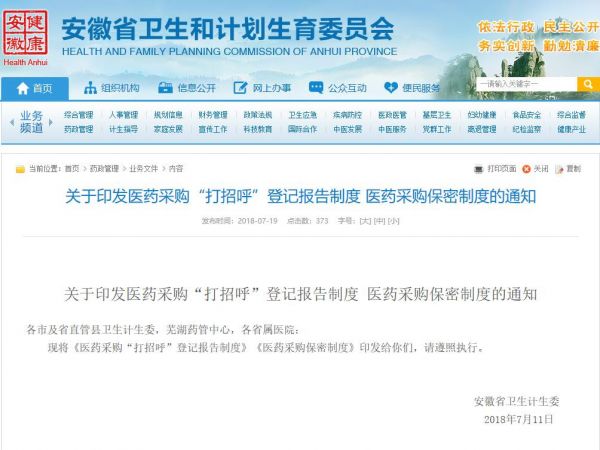 7月19日,安徽省卫生和计划生育委员会官网发布《关于印发医药采购“打招呼”登记报告制度 医药采购保密制度的通知》(简称《通知》),内容剑指医药行业相关人员违规插手、干预医药采购等不良行为,明令批评教育、诫勉谈话、通报等措施,对造成不良影响及后果的将按有关规定严肃处理,涉嫌犯罪的将直接移送司法机关。