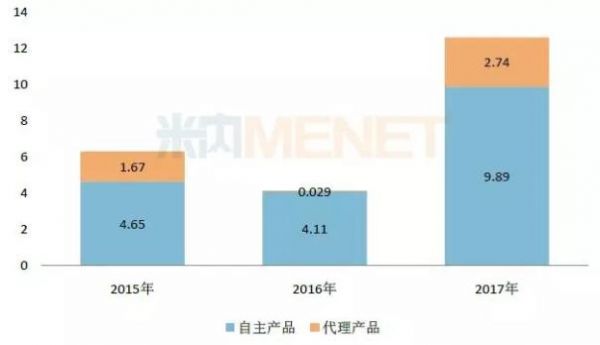 图2:2015-2017年智飞生物自主与代理疫苗产品的销售情况(单位:亿元)