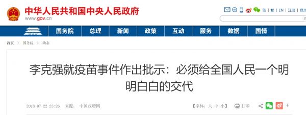 中国政府网于昨天(7月22日)23:26发布了总理对疫苗事件的批示。