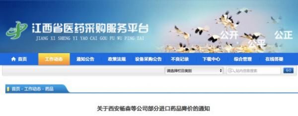 7月19日,江西省医药采购服务中心发布《江西省关于西安杨森等公司部分进口药品降价的通知》。