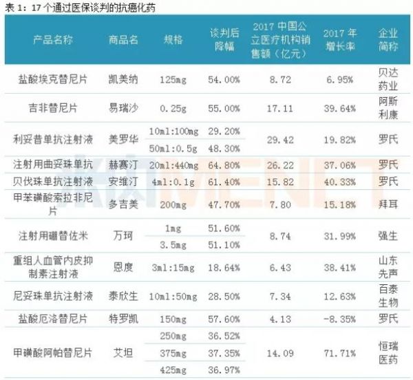 价格谈判的核心是国家通过医保资格让药企放弃单品利润率,实现以价换量,总体上来说,谈判品种的销售收入不受降价影响,并能进一步提高。2015年,首批国家药品价格谈判试点工作开启,共3个品种纳入医保,其中2个为抗癌化药;2017年,又有36个通过国家药价谈判的药品被纳入新版医保乙类范围,其中包括15个高价抗癌化药。