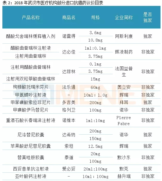 据2017年7月19日人社部公布的第二批国家医保谈判目录结果显示,几乎所有谈判品种均为独家,而此次武汉公布的议价目录中,只有5个品种独家,分别是阿斯利康的醋酸戈舍瑞林缓释植入剂(商品名诺雷得)、拜耳的甲苯磺酸索拉非尼片(商品名多吉美)、诺华的尼洛替尼胶囊(商品名达希纳)、辉瑞的苹果酸舒尼替尼胶囊(商品名索坦)以及默克的西妥昔单抗注射液(商品名爱必妥)。