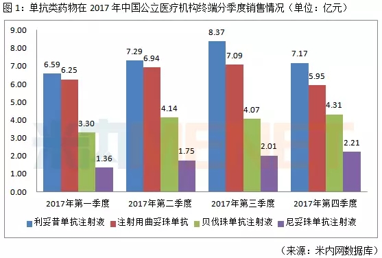 据米内网数据,除了厄洛替尼,其余16个抗癌化药在2017年中国城市公立医院、县级公立医院、城市社区中心以及乡镇卫生院(简称中国公立医疗机构)终端销售额均有不同幅度增长,销售额超过亿元的产品有13个(包括6个超10亿大品种)。近年来,单抗类药物、替尼类药物在抗肿瘤领域“人气”攀升。