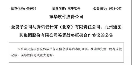 昨日,东华软件股份公司发布公告,其与九州通医药集团股份有限公司、腾讯云计算(北京)有限责任公司签署战略框架合作协议。三方在友好协商的基础上,决定共同开发建设医院处方外流信息共享平台以及药品配送解决方案。
