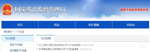 “根据国家药品监督管理局发布的《关于上海威宁整形制品有限公司停产整改的通告》(2018年第61号)和《关于河南省豫北卫材有限公司停产整改的通告》(2018年第62号),以及我省药械集中采购工作有关规定,拟暂停硅凝胶疤痕贴片等产品在线交易资格。” 很显然,这是对这2家械企的产品直接下达“封杀令”,取消其挂网资格,而原因则正是因为飞检不过关。 6月26日—29日,国家药监局分别对上海威宁整形和河南省豫北卫材进行飞行检查。检查发现,2家企业都存在不同程度的一般缺陷和严重缺陷。 7月18日,国家药监局公布检查结果,责令2家企业立即停产整改。