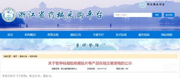 时隔一年,2018年7月24日,浙江省药械采购中心发布《关于暂停硅凝胶疤痕贴片等产品在线交易资格的公示》。