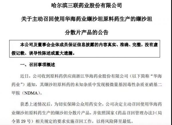 7月16日,哈尔滨三联药业发布公告,宣布召回使用了华海药业的原料药生产的缬沙坦分散片。