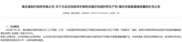 7月26日,重庆康刻尔制药官网发布公告,主动召回使用华海药业缬沙坦原料药生产的 缬沙坦氢氯噻嗪胶囊。