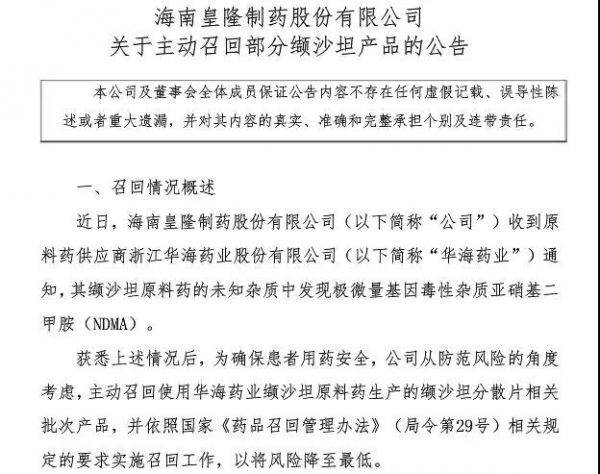 7月16日,海南皇隆制药发布《关于主动召回部分缬沙坦产品的公告》。