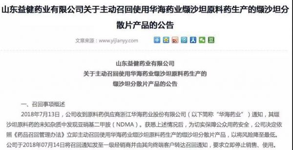 7月26日,山东益健药业官网发布公告,主动召回使用华海药业缬沙坦原料药生产的缬沙坦分散片产品。