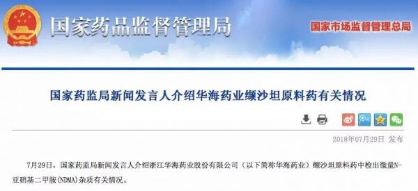 7月29日,国家药监局发布通知,介绍浙江华海药业股份有限公司缬沙坦原料药中检出微量N-亚硝基二甲胺(NDMA)杂质有关情况。