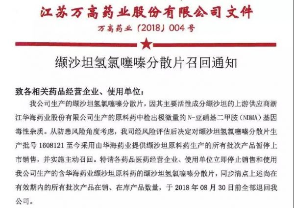 7月25日,江苏万高药业官网发布《缬沙坦氢氯噻嗪分散片召回通知》,决定对缬沙坦氢氯噻嗪分散片生产批号1608121至今采用华海药业提供缬沙坦原料药生产的所有批次产品暂停上市销售,并实施主动召回。