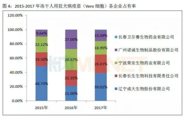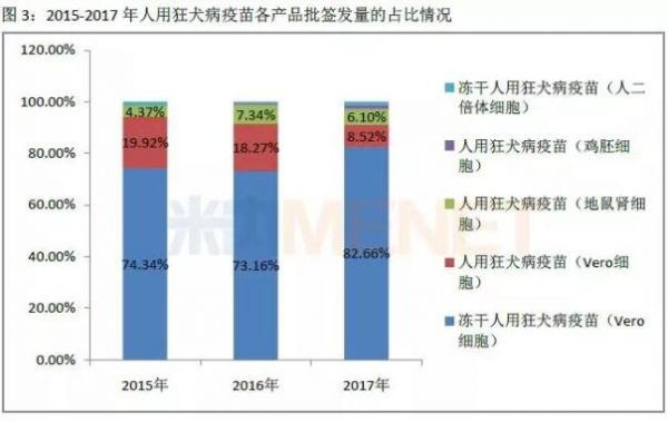 细分至各产品,其中2015-2017年冻干人用狂犬病疫苗(Vero细胞)的批签发量占总批签发量均在70%以上,其次为人用狂犬病疫苗(Vero细胞)2015-2016年的批签发量占18%-20%左右,2017年下滑至8.52%。2015-2017年,人用狂犬病疫苗(地鼠肾细胞)、人用狂犬病疫苗(鸡胚细胞)、冻干人用狂犬病疫苗(人二倍体细胞)批签发量的占比不超过10%。