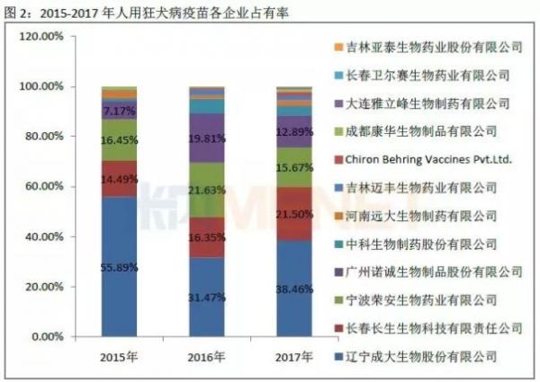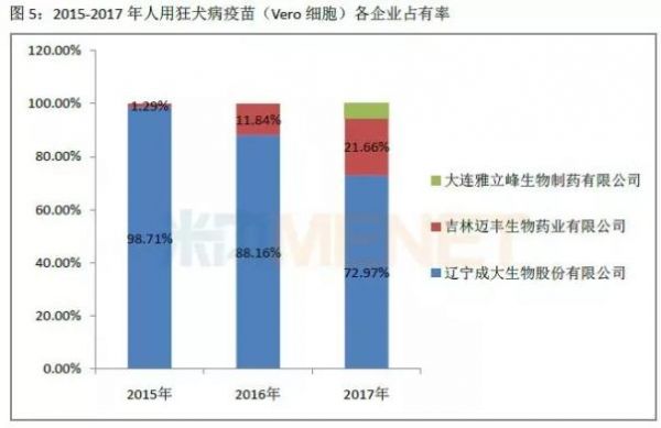 据中检院数据折算,2015-2017年人用狂犬病疫苗的批签发量分别为1752万人份、1268万人份以及1717万人份,其中成大生物占有率排在首位,2015年为55.89%,2016-2017年保持在30%以上。其次是长生生物,2015-2016年的占有率均保持在14%-17%之间,2017年上涨至21.05%。