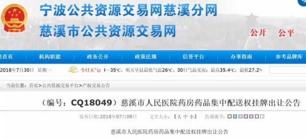 7月30日,宁波公共资源交易网慈溪分网挂出《慈溪市人民医院药房药品集中配送权挂牌出让公告》。