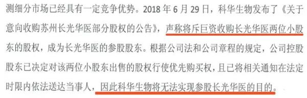 6月30日,长光华医在其官网回应了关于科华生物收购的事项。其中提到,根据公司法和公司章程规定,公司控股股东已决定对两位小股东出售的股权行驶优先购买权,且已将通知在法定时限内送达当事人,因此科华生物将无法实现参股长光华医的目的。