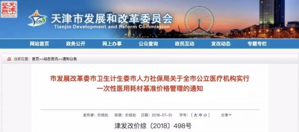 7月31日,天津市发展和改革委员会官网发布《市发展改革委市卫生计生委市人力社保局关于全市公立医疗机构实行一次性医用耗材基准价格管理的通知》(津发改价综〔2018〕498号)(以下称《通知》),对天津市所有公立医院临床使用的全部一次性医用耗材实行新的价格管理机制,自8月1日起正式实施。