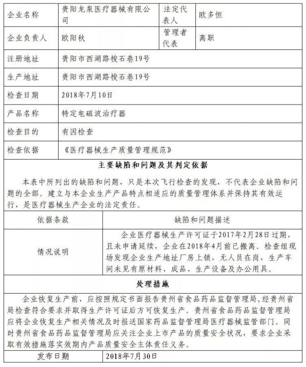 对贵阳龙泉医疗器械有限公司飞行检查通报