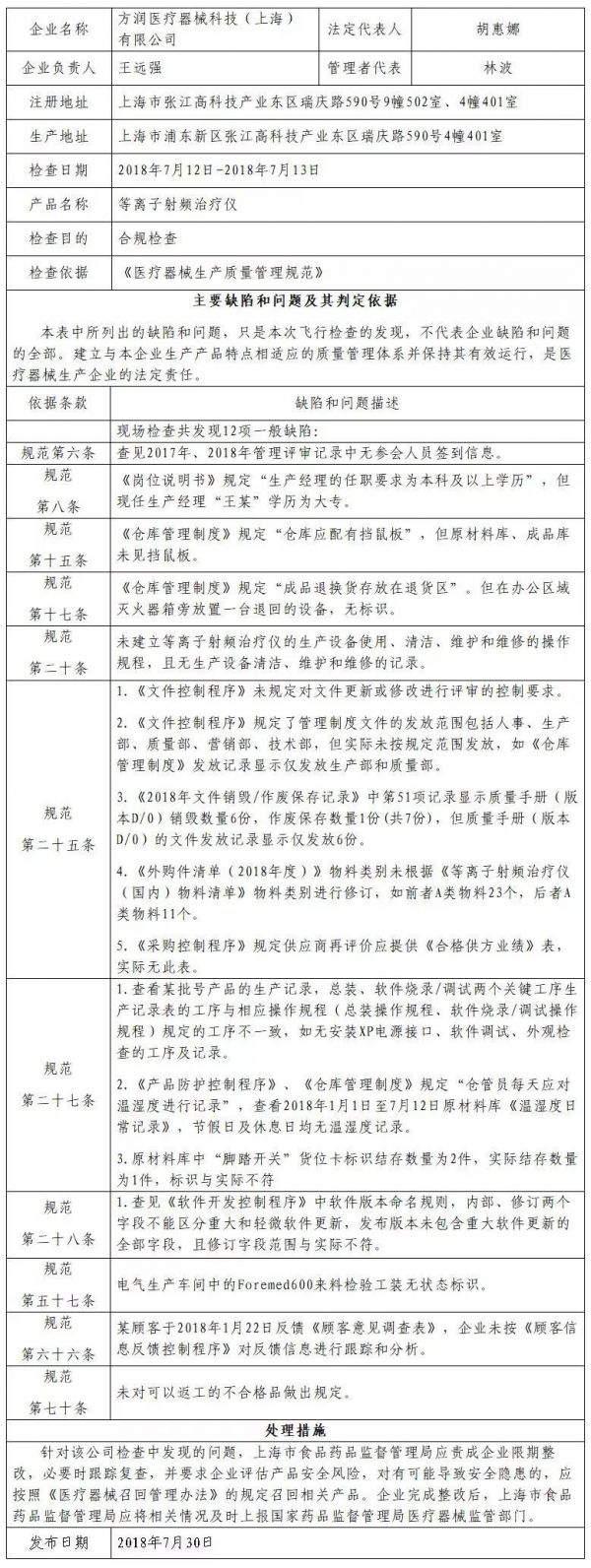 对方润医疗器械科技(上海)有限公司飞行检查通报