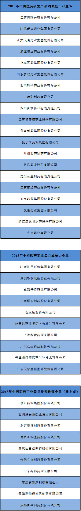 会上还发布了“2018年中国医药研发产品线最佳工业企业20强、2018年中国医药工业最具成长力企业10强、2018年中国医药工业最具投资价值企业(非上市)10强”榜单,详见附件。