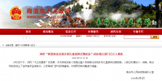 2018年8月3日,网络反映“商洛发现多例儿童接种过期疫苗”。商洛市委、市政府立即安排部署,成立联合调查处置领导小组,连夜开展调查处置工作。
