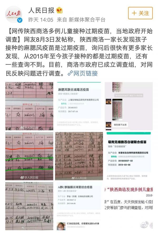8月3日,商洛市人民政府在官方网站表示,经调查,网络反映的乙脑减毒活疫苗、A群流脑多糖疫苗、无细胞百白破疫苗、麻腮风疫苗等均在有效期内。