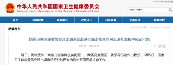 近日,网络反映“商洛儿童接种疫苗问题”,我委高度重视,委领导迅速作出批示。8月5日,国家卫生健康委员会派出调查组赶赴陕西省商洛市开展现场核查工作。