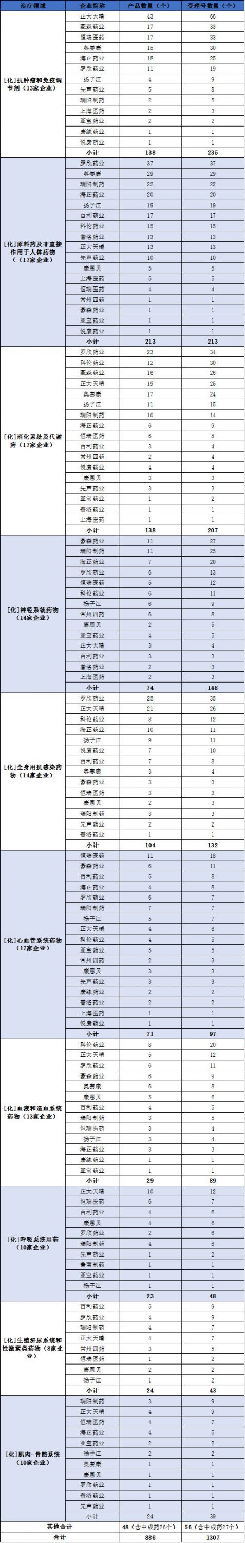 这13家药企1类新药评审状况、治疗领域分布和品种基本情况如下表: